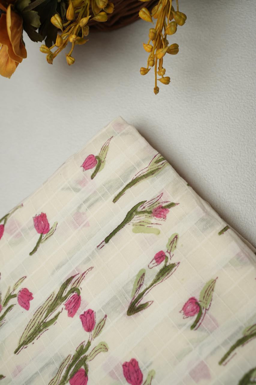 Enhance your designs with our  printed cotton fabric, beautifully detailed with Floral Motif   Featuring mustard floral motifs on a soft ivory base, this fabric blends traditional charm with subtle festive sparkle.